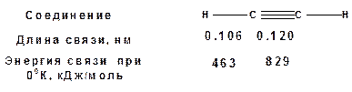Энергия тройной связи 829 кДж/моль, что больше энергии двойной связи 607.1 кДж/моль, ординарной связи Сsp3–Сsp3 - 349.6 кДж/моль и ординарной связи Сsp3–Сsp2 - 360 кДж/моль. Однако две ординарные связи и одна двойная, а также четыре ординарные связи по энергии превосходят одну тройную связь. Поэтому тройная связь легко переходит в две ординарные и одну двойную связь путем присоединения по месту тройной связи двух атомов или атомных групп.