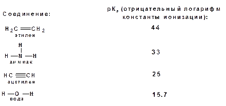 Причем алкины являются кислотами более сильными, чем этилен и аммиак, и более слабыми, чем вода: