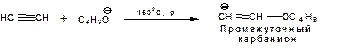 2. На второй стадии алкоксид-ион присоединяется к алкину. Эта стадия является скоростьлимитирующей. Причем, если алкин несимметричный, то присоединение протекает в соответствии с правилом Марковникова, а именно: анион, будучи нуклеофильной частицей, присоединяется к наименее гидрогенизированному атому углерода:
