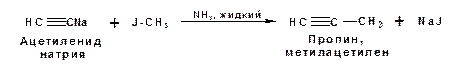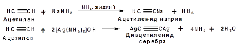 При действии очень сильных оснований алкины, имеющие концевую тройную связь, полностью ионизируются и образуют соли, которые называются ацетиленидами. Ацетилен реагирует как более сильная кислота и вытесняет более слабую кислоту из ее соли: