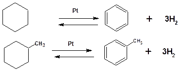 При пропускании парообразного циклогексана или его гомологов над платиной или палладием при 3000С устанавливается равновесие между циклоалканом и ароматическим соединением, которое можно сместить в ту или иную сторону в зависимости от потребности.