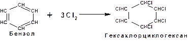 2. В жестких условиях под влиянием ультрафиолетового излучения или яркого солнечного света бензол способен присоединить три молекулы хлора: