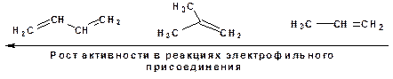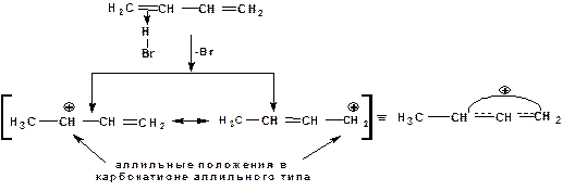 Карбкатионы, образующиеся в реакциях электрофильного присоединения к сопряженным диенам, принято называть карбкатионами аллильного типа. Такие карбкатионы характеризуются повышенной устойчивостью. Они более устойчивы, чем третичные карбкатионы. По этой причине сопряженные диены в реакциях электрофильного присоединения более реакционноспособны, чем алкены и алкины.