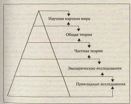В современной методологии — и в нашей стране, и за рубежом – научное знание принято понимать иерархически и мыслить здание социологической науки состоящим из пяти этажей (схема 3.1). Верхний этаж — это научная картина мира (философские предпосылки), четвертый — общая теория, включающая категории самого абстрактного уровня, третий — частные, или специальные, теории, обычно формализованные, логически компактные и конкретные модели социальных процессов.