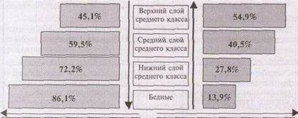 По мере движения вниз вдоль социальной лестницы изменяются экономические ценности. В верхнем слое среднего класса более половины выступают за либеральную модель развития экономики (свободный рынок без вмешательства государства), в среднем слое наиболее популярной является модель рыночной экономики с мягким государственным регулированием, а для низших слоев российского общества экономическим идеалом служит модель госкапитализма (современный вариант нэпа).