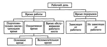 Продолжительность рабочего дня складывается из времени работы и перерывов (рис. 15.1). В свою очередь, время работы включает следующие составляющие: