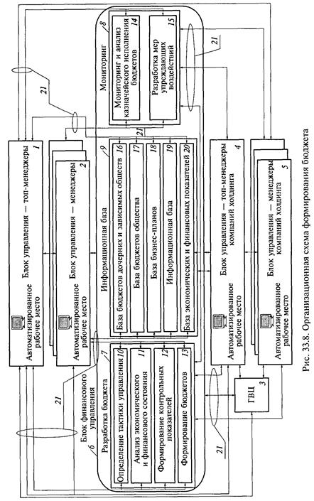 На рис. 33.8 приведена предлагаемая информационная модель механизма финансового управления электроэнергетическим холдингом, выполненная на примере РАО «ЕЭС России». Модель содержит блок управления / топ-менеджеров холдинга, соединенный каналами связи с блоком 2 управления менеджеров холдинга, ГВЦ 3, блоком 4 управления топ-менеджеров компаний холдинга и блоком 5 управления менеджеров компаний, соединенными между собой каналами связи 21. Модель дополнительно содержит блок финансового управления 6, выполненный в виде соединенных между собой блоков 7 разработки бюджета, блока 8 финансового мониторинга, информационной базы знаний 9, соединенных каналами связи с блоками 1, 2, и главным вычислительным центром 3. Блок 7 разработки бюджета выполнен в виде соединенных между собой блоков 10, 11, 12, 13 соответственно определения тактики управления, анализа экономического и финансового состояния, формирования контрольных показателей и бюджетов. Блок мониторинга финансового состояния £ выполнен в виде соединенных между собой блоков мониторинга и анализа казначейского исполнения бюджета 14 и разработки мер упреждающих воздействий 15.