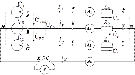 На рисунке 9 показана такая схема с возможностью измерения фазных (линейных) токов, тока в нейтральном проводе амперметрами А и напряжения UN между нейтральными точками генератора и приемника вольтметром V.