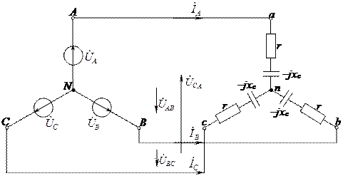 В качестве примера на рисунке 10 показана «трехпроводная звезда» с симметричным активно-емкостным приемником. Предположим, что активное и емкостное сопротивления равны друг другу по величине (модулю) r = xc. Комплексные сопротивления фаз одинаковы и равны