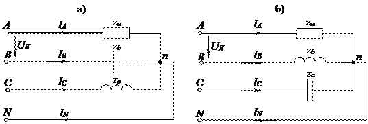 Нас будут интересовать фазные напряжения приемника как падения напряжения, создаваемые фазными (линейными) токами на полных сопротивлениях za, zb, zc фаз (UФ = IФzФ).