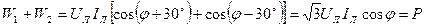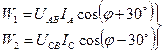 Из диаграммы можно определить, что a1 = φ + 30°; a2 = φ – 30°. Тогда показания ваттметров