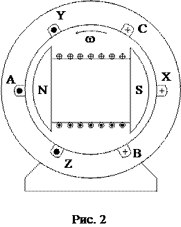 Простейший генератор трёхфазного тока (рис. 2) представляет собой неподвижный пустотелый цилиндр, набранный из листовой электротехнической стали (статор), внутри которого вращается с постоянной скоростью w постоянный электромагнит N-S (ротор). На внутренней поверхности статора расположены три витка A-X, B-Y, C-Z, стороны которых расположены в двух диаметрально противоположных канавках (пазах). Магнитные оси этих витков сдвинуты относительно друг друга на треть пространственного периода (в показанном на рис. 2 двухполюсном генераторе - на 120 геометрических градусов). При вращении ротора его магнитная ось N-S поочерёдно набегает на начала фаз обмотки статора A, B, C, в результате чего амплитуды ЭДС EmA, EmB, EmC будут сдвинуты по фазе на одну треть временного периода T (рис. 1).