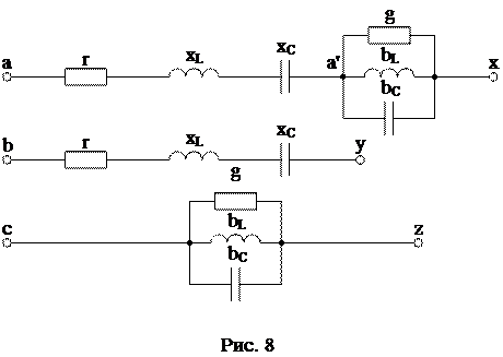 Фазы приёмника в общем случае содержат активные и реактивные сопротивления и проводимости (рис. 8). Фаза a - x имеет неразветвлённый участок a – a' и участок a' – x с параллельным включением элементов, фаза b – y – последовательное, а фаза c – z – параллельное соединение элементов.