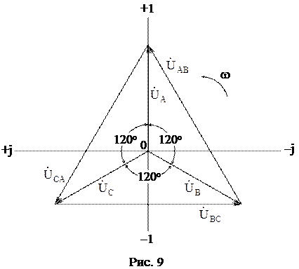 Для записи в комплексной форме фазных напряжений генератора, образующих симметричную звезду векторов (рис. 9),целесообразно совместить вектор напряжения фазы