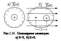 Во внешнем электрическом поле происходит деформация электронных оболочек атомов и молекул. «Центры тяжести» положительных и отрицательных зарядов смещаются относительно друг друга (рис.1.14,б). Молекула становится подобной электрическому диполю с плечом l, равным расстоянию между центрами «тяжести» положительных и отрицательных зарядов, и, следовательно, приобретает дипольный момент