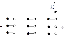 , как показано на рисунке 1.15, где черными кружками обозначены центры «тяжести» отрицательных зарядов, белыми - центры «тяжести» положительных зарядов. В результате сам диэлектрик приобретает результирующий электрический момент. Это явление называется поляризацией диэлектрика. В случае неполярного диэлектрика ее называют электронной или деформационной. Электронная поляризация устанавливается очень быстро (за время ~10-15с) и также быстро исчезает при снятии поля.