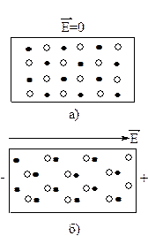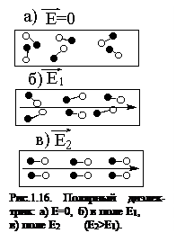 . Молекулы таких диэлектриков называются полярными. Однако, в отсутствие поля оси дипольных молекул в диэлектрике расположены хаотично, что обусловлено тепловым движением (рис.1.16, а). Поэтому диэлектрик в целом неполяризован. Под влиянием электрического поля молекулы начинают ориентироваться вдоль силовых линий. Степень ориентации зависит от свойств диэлектрика, величины напряженности поля