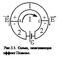 В 1834 г. Ж.Пельтье обнаружил явление, обратное термоэффекту. Если по замкнутой цепи, составленной из двух разнородных проводников 1 и 2, пропускать ток, то один из спаев нагревается, другой - охлаждается. На рис.3.3 показана замкнутая цепь, состоящая из двух разнородных проводников с попарно спаянными концами и источник тока e.