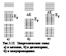 В диэлектриках и полупроводниках валентная зона полностью заполнена электронами, а уровень Ферми соответствует самому верхнему уровню этой зоны (рис.3.12 б, в). Различие их электрических свойств определяется шириной запрещенной зоны DЕ.