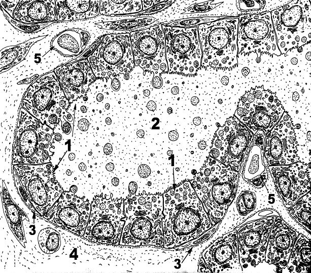 Сальная железа является простой альвеолярной разветвленной железой. Между альвеолами располагается рыхлая волокнистая соединительная ткань (6). Клетки концевых секреторных отделов – себоциты. Базальные клетки (1) располагаются на базальной мембране. Они имеют кубическую или уплощенную форму. В них много гликогена, митохондрий, свободных рибосом. Слабо развиты комплекс Гольджи, гранулярная и агранулярная ЭПС. Базальные себоциты, которые выстилают верхнюю часть альвеолы не принимают участия в продукции кожного сала, являясь камбием. Дифференцируясь клетки увеличиваются в обьеме. В них хорошо развиты гранулярная и агранулярная ЭПС, комплекс Гольджи, много липидных капель. При дальнейшей дифференцировке обьем клеток значительно увеличивается (3). Они заполнены липидами. Между липидными гранулами – лизосомы, митохондрии. В клетках, накопивших секрет (3) ядра клеток становятся пикнотическими или совсем не видны, поскольку в клетке большое количество жира (агрегаты из жировых капель). В клетках увеличивается количество гидролитических ферментов в лизосомах. Начинается разрушение клеток (4), а секрет-кожное сало (состоит из триглицеридов) попадает в выводной проток. Такой тип секреции назывется голокриновым. Этот термин означает, что в процессе секреции происходит разрушение и гибель всей клетки. Голокриновые железы встречаются редко. Единственным широко распространенным примером желез такого типа являются сальные железы кожи. Тестостерон увеличивает интенсивность митоза в себоцитах. Появляется много зрелых клеток и отток кожного сала затруднен (угри). Тиреоидные гормоны усиливают функцию себоцитов. Эстрогены угнетают функцию сальных желез, а прогестерон ее стимулирует (у женщин).