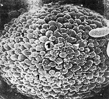 Рис. 12. Тучная клетка (лаброцит, тканевой базофил) рыхлой волокнистой соединительной ткани в момент дегрануляции. Сканирующая электронная микроскопия.