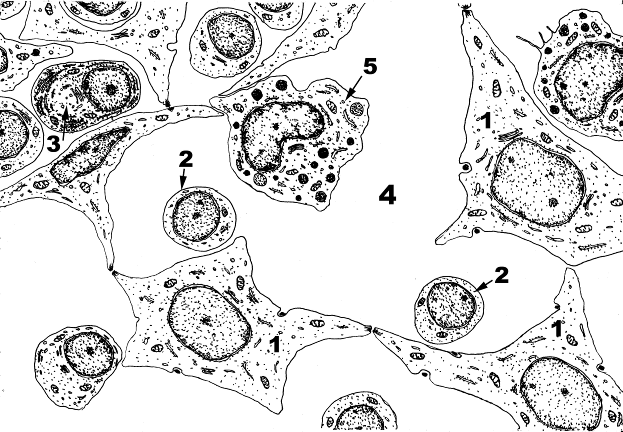 Селезенка – периферический орган кроветворения и иммунной защиты. Участвует в формировании гуморального и клеточного иммунитета. В ней происходит лимфопоэз, элиминация отживших и поврежденных эритроцитов и тромбоцитов, депонирование крови и др. Снаружи селезенка покрыта брюшиной и капсулой из плотной соединительной ткани. От последней вглубь органа отходят трабекулы. В селезенке выделяют белую и красную пульпу. Красная пульпа внешне отличается от белой: в ней меньше лимфойдных элементов. Она образована ретикулярной тканью (5), образующей ее строму, многочисленными кровеносными сосудами (1), главным образом синусоидного типа и клеточными элементами крови (3), придающими красный цвет. Синусы являются началом венозной системы селезенки. Их диаметр колеблется от 12 до 40 мкм в зависимости от кровенаполнения. Стенка синусов образована эндотелиоцитами (4), которые располагаются на прерывистой базальной мембране. Перициты отсутствуют. Венозные синусы вследствие высокого содержания клеток крови на микропрепаратах плохо различимы. При растяжении синусов в результате кровенаполнения, между эндотелиальными клетками образуются щели, через которые кровь может проходить в ретикулярную строму (3). В красной пульпе находятся макрофаги селезенки (2), которые поглощают старые и поврежденные эритроциты. Гемоглобин, поглощенных макрофагами эритроцитов расщепляется на билирубин и содержащий железо трансферрин. Билирубин транспортируется в печень, где войдет в состав желчи. Трансферрин захватывается из кровотока макрофагами красного костного мозга и вновь участвует в образовании гемоглобина развивающихся там эритроцитов.