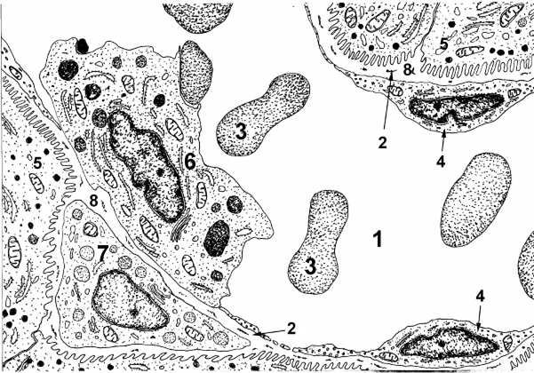 Капилляр. 2.Перывистая базальная мембрана. 3.Эритроцит. 4.Эндотелиоцит. 5.Фрагмент печеночного эпителиоцита (гепатоцита). 6.Звездчатый макрофаг (клетка Купфера). 7.Перисинусоидальный липоцит (клетка Ито). 8.Пространство Диссе (периваскулярное).