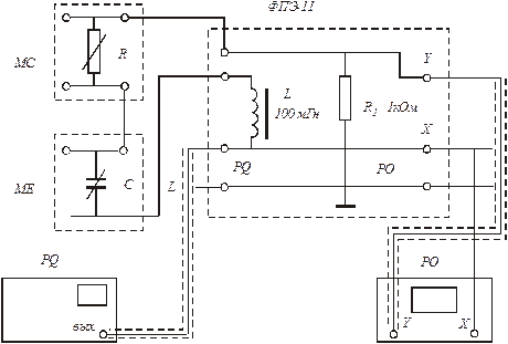 Исследуемый колебательный контур состоит из катушки L, магазина емкостей МЕ, магазина сопротивлений МС и сопротивления R1. Магазины сопротивлений и емкостей собраны в отдельных модулях установки. ФПЭ-11− модуль для изучения вынужденных колебаний. Источником вынуждающей ЭДС служит звуковой генератор PQ, частоту которого Ω можно менять. Измерения проводятся с помощью электронного осциллографа PO.