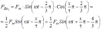 Это выражение пульсирующей волны намагничивающей силы фазы. Более удобно иметь дело с вращающейся намагничивающей силой, но с постоянной амплитудой. Заменим пульсирующую н.с. двумя бегущими волнами, используя тригонометрическую формулу