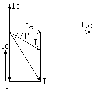 Предприятие без СД имеет в векторной форме Uc,I и угол f, где ток Il – индуктивный ток потребляемый из сети. Если теперь использовать СД в перевозбужденном режиме, получим емкостной ток Ic, который скомпенсирует частично ток Il. Результирующий реактивный ток уменьшится, а это приведет к уменьшению тока до I1, угол f1 уменьшится, т.е. возрастет cosf. Из этого примера видим, что используя на предприятиях СД в перевозбужденном режиме, улучшает cosf установки и уменьшает потери в сети.