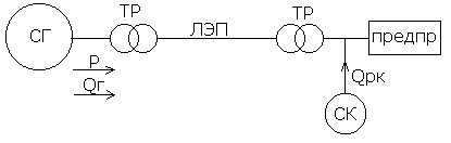 Синхронный генератор вырабатывает активную и реактивную мощность, которая передается через трансформаторы и линию электропередачи предприятиям. Если установить в узле нагрузки А синхронный компенсатор в режиме перевозбуждения, то он на месте будет вырабатывать значительную часть реактивной мощности и отдавать ее потребителям предприятий разгрузив синхронный генератор и линию электропередач в значительной части от реактивной мощности. Это приведет к уменьшению общего тока ЛЭП, уменьшатся потери в СГ, тр-рах и ЛЭП.