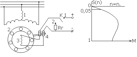 При пуске в ход двигателя обмотка статора включается в сеть переменного тока. Обмотка возбуждения (3) на период пуска замыкается на некоторое сопротивление Rг, рис. 45, ключ К в положении 2, сопротивление Rг = (8-10)Rв. В начальный момент пуска при S = 1, из-за большого числа витков обмотки возбуждения, Вращающее магнитное поле статора наведет в обмотке возбуждения ЭДС Ев, которая может достигнуть весьма большого значения и если при пуске не включить обмотку возбуждения на сопротивление Rг произойдет пробой изоляции.