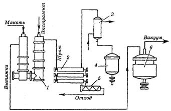 Экстракцию органическими растворителями проводят в вертикальном шнековом экстракторе 1, в который; загружают сухую мякоть и навстречу ей непрерывно подают экстрагент. Истощенное сырье (шрот) поступает на рекуперацию экстрагента в шнековый испаритель 2, обогреваемый паром. Пары экстрагента конденсируются в холодильнике 3 и в виде конденсата направляются в сборник 4. Шрот, освобожденный от экстрагента, с помощью шнека 5 выгружается в сборник отходов. Вытяжка, насыщенная каротиноидами, подается в вакуум-выпарной аппарат 6где после удаления экстрагента получают пасту каротиноидов, которую купажируют маслом до стандартного содержания каротиноидов.