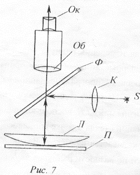 Свет от источника S проходит через конденсорную линзу К и попадает на наклонный светофильтр Ф, расположенный под углом 45° к направлению луча. Отразившись от светофильтра, свет попадает на линзу Л и далее – на воздушный клин, образованный линзой и пластиной П. Лучи, отраженные от верхней и нижней поверхностей клина, проходят сквозь линзу Л в обратном направлении и попадают в окуляр Ок зрительной трубы. Интерференционная картина, возникающая при их наложении, имеет вид чередующихся светлых и темных колец, интенсивность которых убывает к периферии (см. рис.6). В центре колецнаходится темное пятно минимум нулевого порядка.