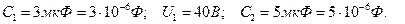 11. Два конденсатора емкостью С1=5мкФ и С2=8мкФ соединены последовательно и присоединены к батарее с э.д.с. Е=80 В. Определить заряды q1 и q2 конденсаторов и разности потенциалов U1 и U2 между их обкладками.