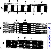 Механизм мышечного сокращения. Мышцы состоят из мышечных волокон, которые состоят из множества тонких нитей - миофибрилл, расположенных продольно. Каждая миофибрилла состоит из протофибрилл - нитей сократительных белков актина и миозина. Перегородки, называемые 2-пластинами, разделяют миофибриллы и, следовательно, мышечное волокно на участки - саркомеры. В саркомере наблюдают правильно чередующиеся поперечные светлые и темные полосы. Эта поперечная исчерченность миофибрилл обусловлена определенным расположением нитей актина и миозина. В центральной части каждого саркомера свободно расположены толстые нити миозина. На обоих концах саркомера находятся тонкие нити актина, прикрепленные к Z-пластинам. Нити миозина выглядят в световом микроскопе как светлая полоска (Н-зона) в темном диске, который дает двойное лучепреломление, т. к. содержит нити миозина и актина и называется анизотропным или А-диском. По обестороны от А-диска находятся участки, которые содержат только тонкие нити актина и кажутся светлыми, т. к. они обладают одним лучепреломлением и называются изотропными или j-дисками. По их середине проходит темная линия - Z-мембрана. Именно благодаря такому периодическому чередованию светлых и темных дисков сердечная и скелетная мышцы выглядят исчерченными (поперечно-полосатыми) (рис. 6).