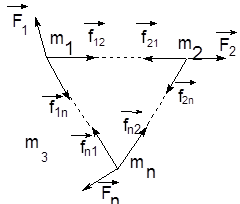 Рассмотрим общий случай - систему n взаимодействующих материальных точек (тел). На каждое тело действуют внутренние и внешние силы. Силы взаимодействия между телами системы называются внутренними, а силы, которые действуют со стороны тел, не входящих в рассматриваемую систему, называются внешними. Массы точек - m1, m2, ..., mn, скорости их движения - v1, v2,...,vn. Пусть