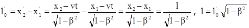 Рассмотрим стержень, расположенный вдоль оси x’ и покоящийся относительно системы K’. Длина стержня в этой системе будет l0’=x’2 - x’1. Определим длину этого стержня в системе К, относительно которой он движется со скоростью v. Для этого необходимо измерить координаты его концов x2 и x1 в один и тот же момент времени (т.е. Dt=0). Их разность l = x2 - x1 и будет искомой длиной в системе К. Используя преобразования Лоренца, можно получить: