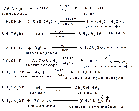 Примеры реакций с участием бромистого этила, в качестве субстрата, приведены ниже:
