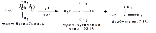 По механизму SN1, например протекает гидролиз трет-бутилбромида:
