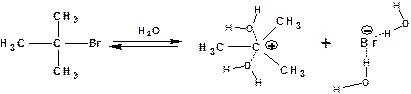 Бромид-ион образует с молекулами воды водородные связи и тем самым стабилизируется. Образующийся карбкатион также стабилизируется сольватацией растворителем. Но большее значение имеет стабильность самого карбкатиона. Он должен быть стабилизирован внутримолекулярными электронными эффектами, т.н. быть третичным или находиться в сопряжении с π-электронной системой (быть резонансно-стабилизированным).