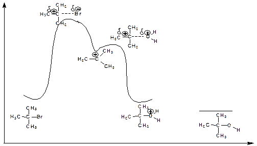 Быстрое присоединение молекулы воды к карбкатиону приводит к катиону трет-бутилгидроксония, кторый затем отщепляет протон с образованием трет-бутилового спирта. Этой схеме механизма соответствует следующая энергетическая диаграмма: