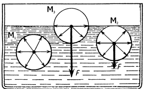 Сила поверхностного натяжения. Молекула M3 (рис. 10.1), расположенная на поверхности жидкости, взаимодействует не только с молекулами, находящимися внутри жидкости, но и с соседними молекулами на поверхности; поэтому силы взаимодействия направлены вдоль поверхности жидкости.