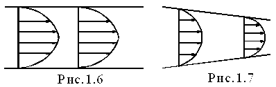 Неравномерным движением называется такое, при котором распределение основ-ных параметров (скоро- стей, давлений и т. д.) по сечению изменяется вдоль потока. Примером может служить движение в сужающейся трубе, рис. 1.7.
