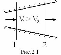 (имеющая размерность ускорения) будет первой составляющей (слагаемым) компоненты ускорения. Кроме того, скорость частицы может изменяться от точки к точке (как при стационарном, так и при нестационарном режимах); простейший пример – течение жидкости в расширяющемся канале, рис. 2.1, где скорость непрерывно уменьшается вдоль потока. В этой второй составляющей ускорения по смыслу должны присутствовать производные от скорости по координатам, но для сохранения размерности ускорения они должны умножаться на скорость. Так как обе рассматриваемые компоненты принципиально независимы, то общее ускорение жидкости частицы состоит из двух слагаемых.