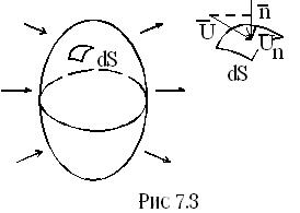 Очевидно, что в любой точке внутри потока жидкость не возникает и не исчезает, поэтому можно считать что в любой точке должны выполняться определённые соотношения, содержащие скорость и выражающие закон сохранения массы. Для вывода уравнения такого рода представим внутри потока воображаемую неподвижную замкнутую поверхность, через которую может свободно протекать жидкость. Положительное направление нормали ориентировано внутрь поверхности, рис. 7.1. Любой бесконечно малый элемент