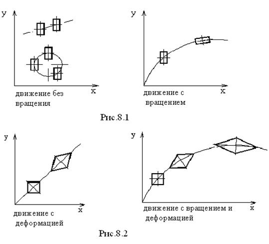 Помимо вращательного движения жидкая частица может деформироваться, и для каждой её точки это будет эквивалентно участию в так называемом деформационном движении. Все возможные виды наглядно изображены на рис. 8.1 и 8.2.