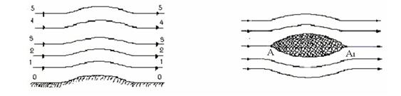 Построение линий тока является одним из средств наглядного изображения особенностей течения. Поверхность тела, непроницаемую для жидкости, возможно представить состоящей из линий тока. Например, при плоском обтекании препятствия на дне канала сама твёрдая граница будет линией тока, рис.Д.1.1,которая часто называется нулевой. В общем случае через любую точку движущейся среды в данный момент времени можно провести лишь одну линию тока, но существуют некоторые особые точки, в которых это правило нарушается. В особых точках линии тока пересекаются, следовательно, в этих точках вектор скорости имеет разные направления, что при конечном значении скорости невозможно. Поэтому в особых точках величина скорости должна быть равна либо нулю, либо бесконечности. При обтекании тела нулевая линия тока, образующая непроницаемый контур, имеет особые точки А и A1, рис. Д.1.2. В этих точках, называемых критическими, величина скорости равна нулю.