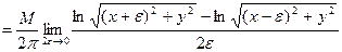 то получим в процессе течение, которое называется диполем. Постоянная М, характеризующая этот поток, называется моментомдиполя, а ось Оx – осью диполя. На основании зависимостей (Д.2.12) и (Д.2.13) определяем потенциал скорости и функцию тока рассматриваемого течения (диполя) так, как будет показано ниже.