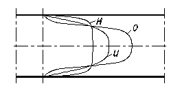 Из последнего выражения следует, что если в слое жидкости на расстоянии r от оси трубы в результате охлаждения увеличится вязкость, то соответственно уменьшиться градиент скорости. Это приведет к изменениям обычного параболического распределения скорости в поперечном сечении трубы; характер этих изменений показан на рис. Д.2.1. Кривая и относится к изотермическому течению, кривая о – к случаю остывания, кривая н – к случаю нагревания. По мере продвижения жидкости по трубопроводу температура потока приближается к температуре окружающей среды и кривая распределения скоростей все меньше отличается от нормальной параболы. Скорость жидкости будет поэтому, функцией не только радиуса, но и расстояния от начального сечения.